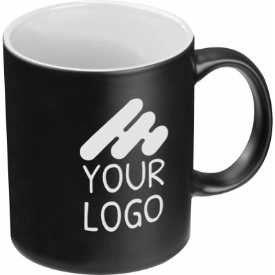 Czarny kubek ceramiczny z kolorowym wnętrzem, pojemność 300 ml. Grawer w kolorze wnętrza kubka.