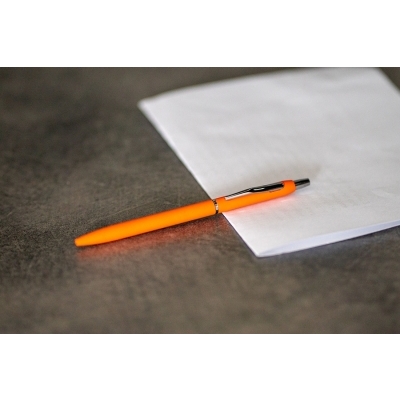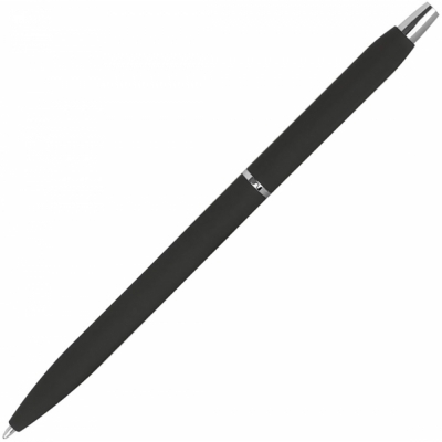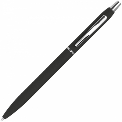 Metalowy długopis o gumowanej powierzchni ze srebrnymi akcentami. Posiada wkład piszący na czarno.