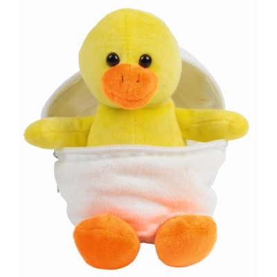 Pluszowa kaczka LENI z miękkim futerkiem. Umieszczona wewnątrz pluszowego jajka z zamkiem błyskawicznym. Z sercem do nadruku.