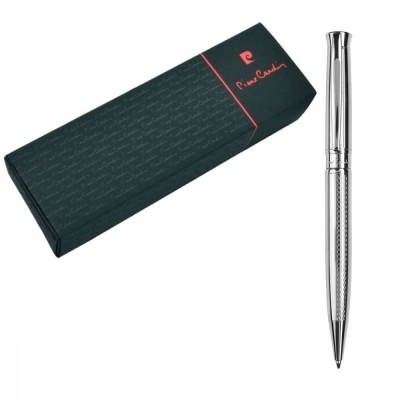 Metalowy długopis o bardzo eleganckim kształcie, zdobiony drobnym grawerem na całej powierzchni. Długopis posiada wkład piszący na niebiesko z końcówką 1mm. W zestawie znajduje się zapasowy czarny wkład, długopis pakowany w ozdobne pudełko Pierre Cardin, wyposażony w certyfikat autentyczności.