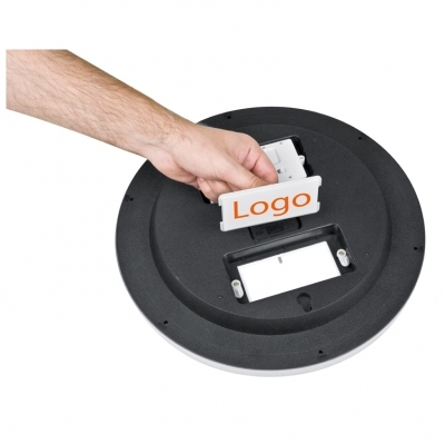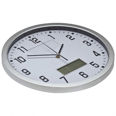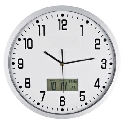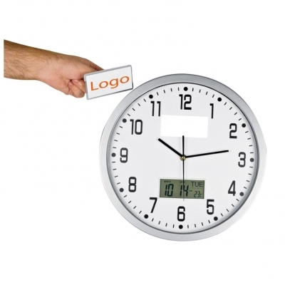 Analogowy zegar ścienny CrisMa z dużym, cyfrowym wyświetlaczem, pokazującym datę, dzień tygodnia oraz temperaturę. Logotyp można umieścić na specjalnym panelu reklamowym, pod ochronną szybką zegara.